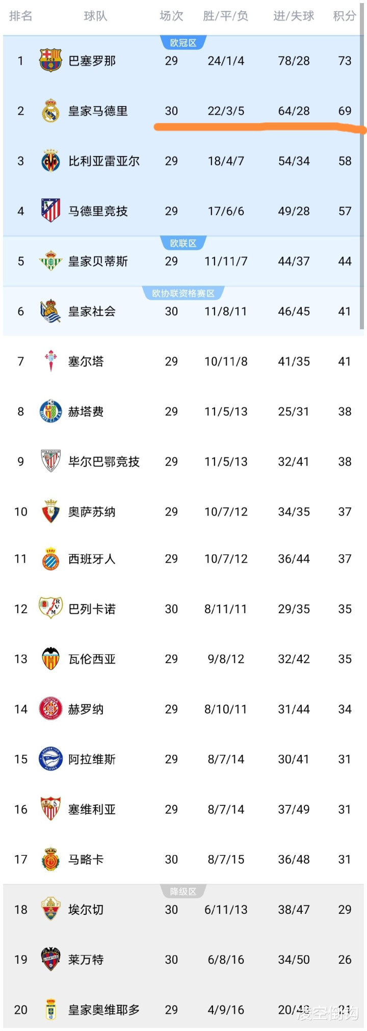 可以看到,皇马输球之后,积分停留在了69分,在多赛一场的情况下,落后领头羊巴塞罗那队4分,如果本轮巴萨取得胜利,那么皇马就将落后巴萨7分,巴塞罗那这显然是渔翁得利啊。天助巴萨啊。而皇家社会赢球之后,积分上涨到了41分,皇家社会排名第6,逼近欧联区了,皇家贝蒂斯要小心了。而马略卡赢球之后,积分上涨到了31分,一下子就逃离了降级区,皇马这是给马略卡送温暖吗?莱万特输球之后,继续排名倒数第二。